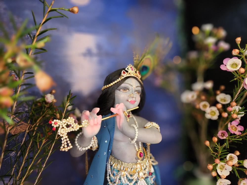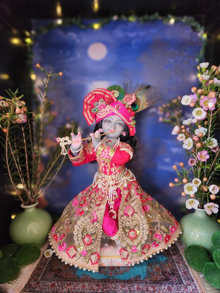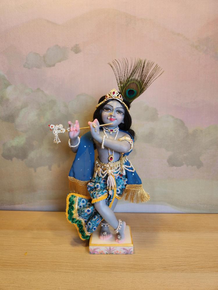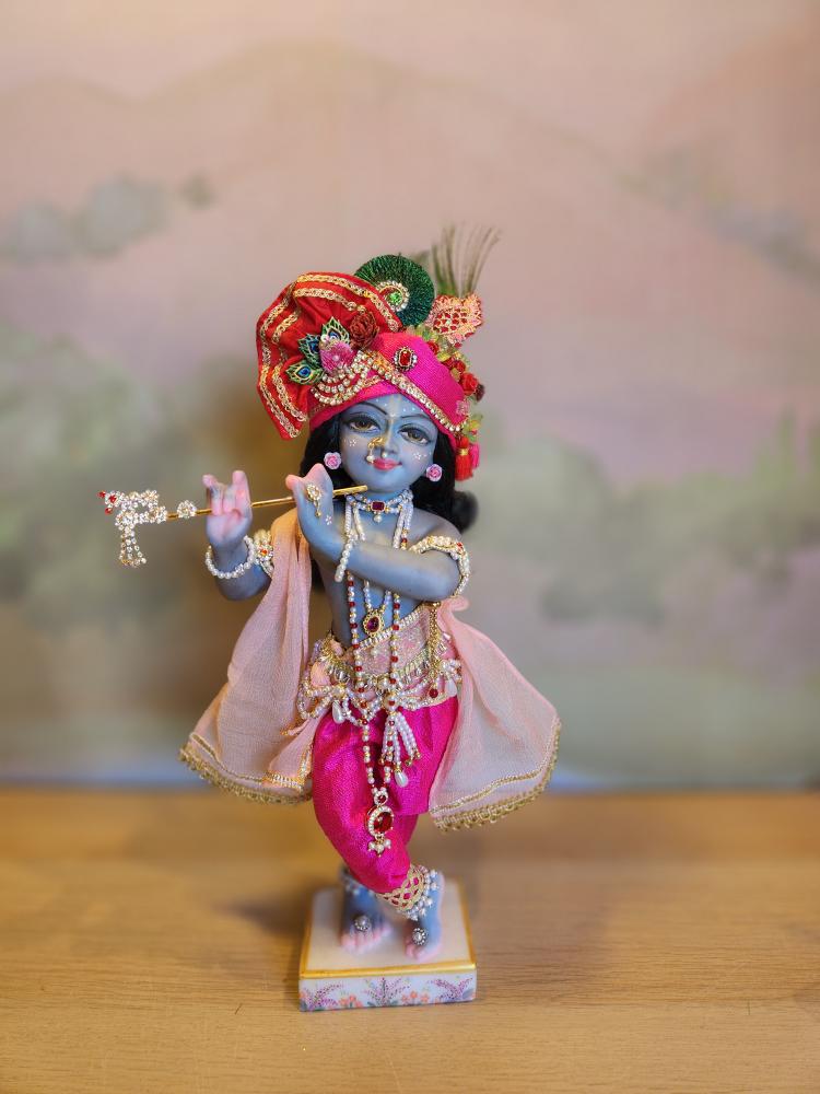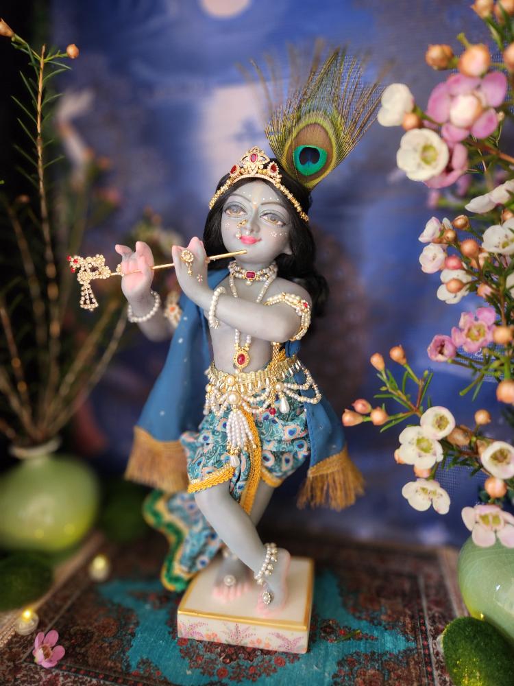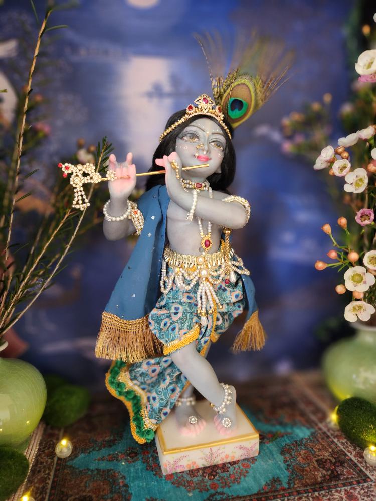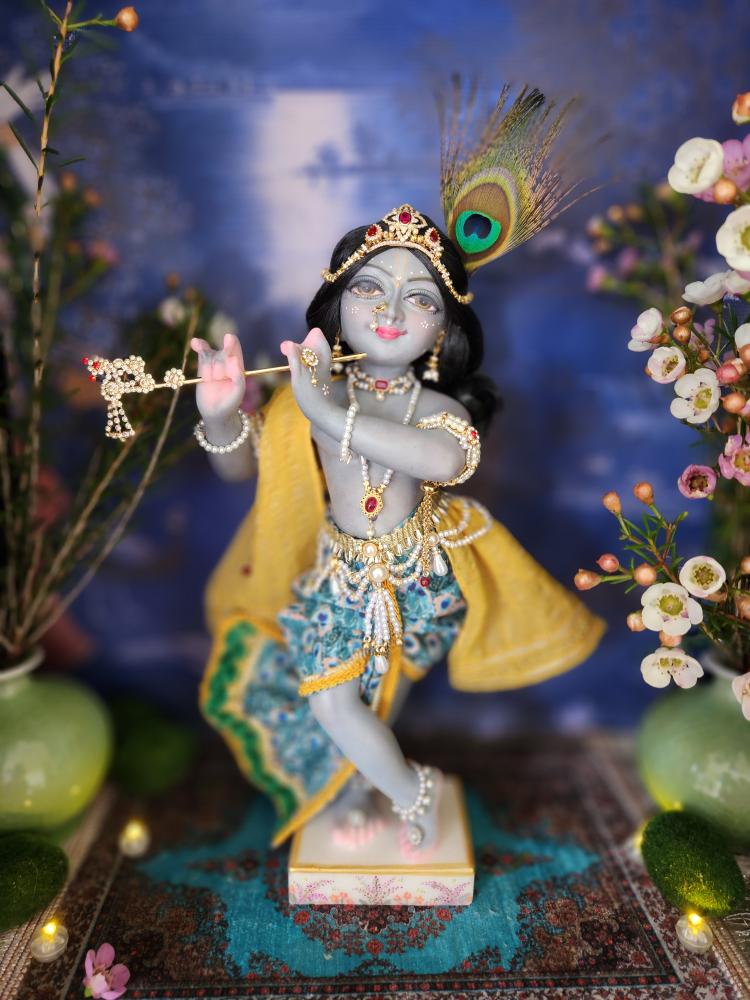 This exquisite deity is lovingly painted with a stormy grey-blue complexion, soft and sweet like a monsoon cloud, with gentle pink accents on his delicately carved hands and feet. His lips are set in a captivating smile, and his eyes are full of a gentle, dreamy innocence. Every detail, from his graceful posture to his finely sculpted face, speaks to the devotion poured into his creation.