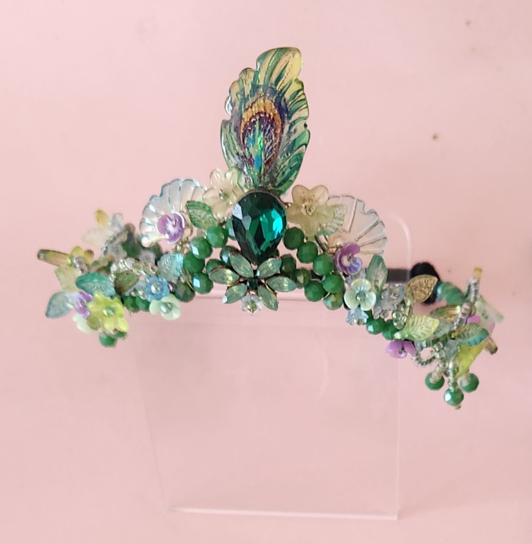 • The Flowering Mukut (Crown): A regal, blossoming canopy that frames the face in the colors of the sacred grove.